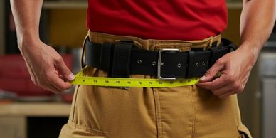 Put your Turn Outs On, Take a piece of webbing, string, rope or your current belt put it around your waist, bring two ends together in the front where you want the strap to end. When doing this stand up straight for best measurements results.